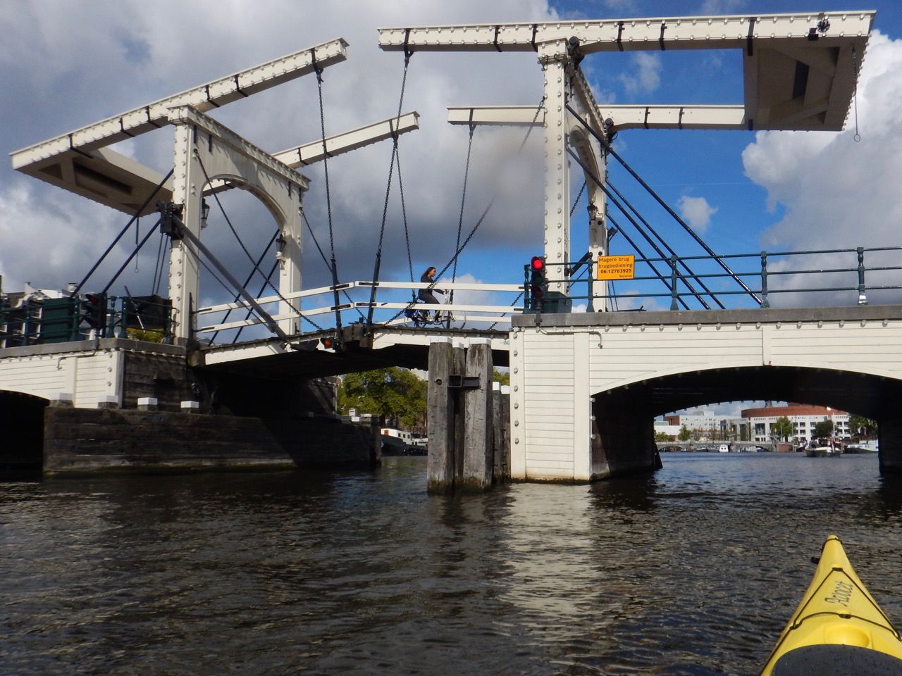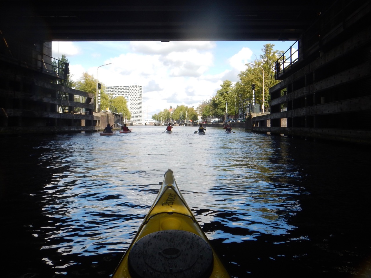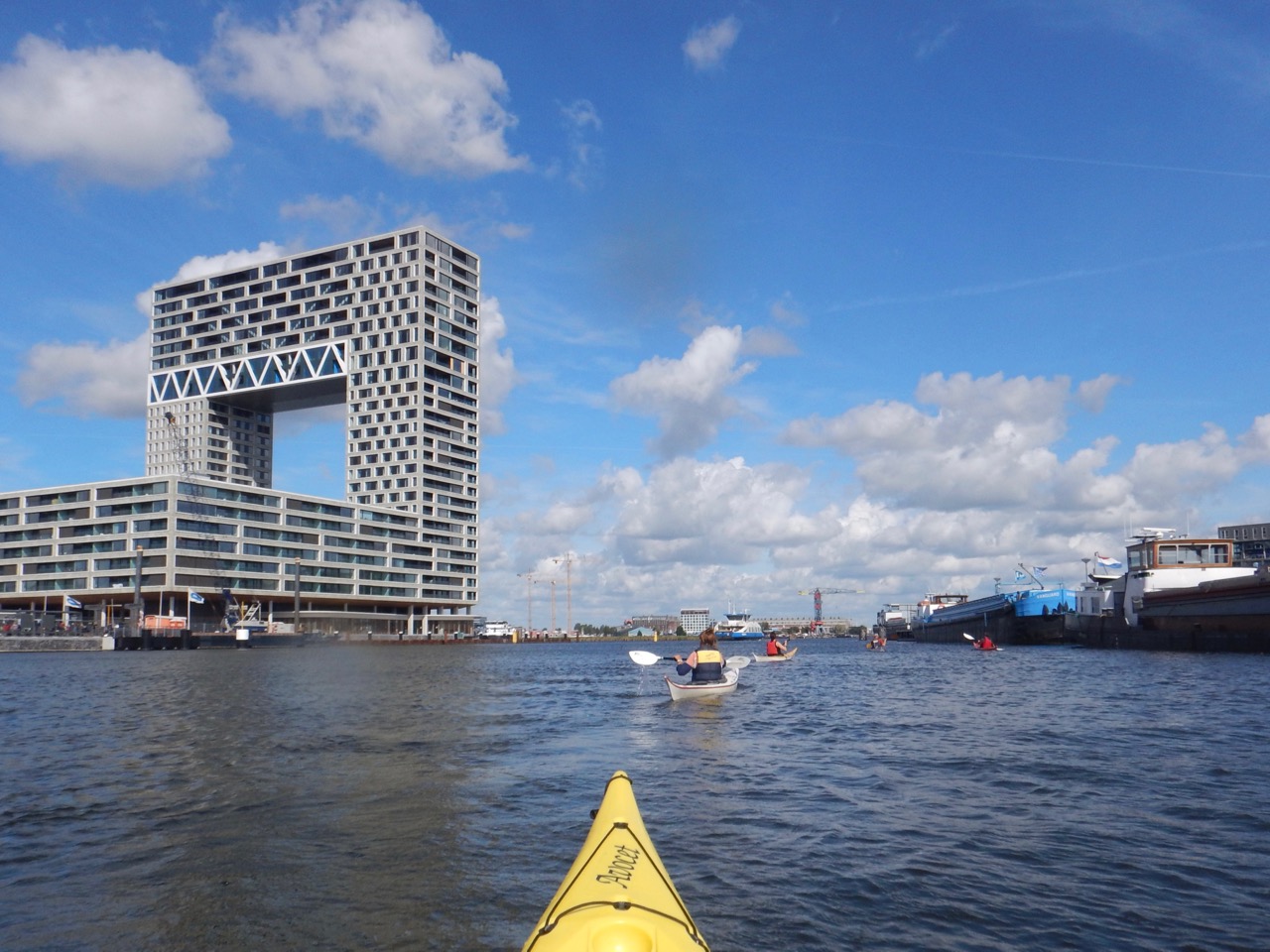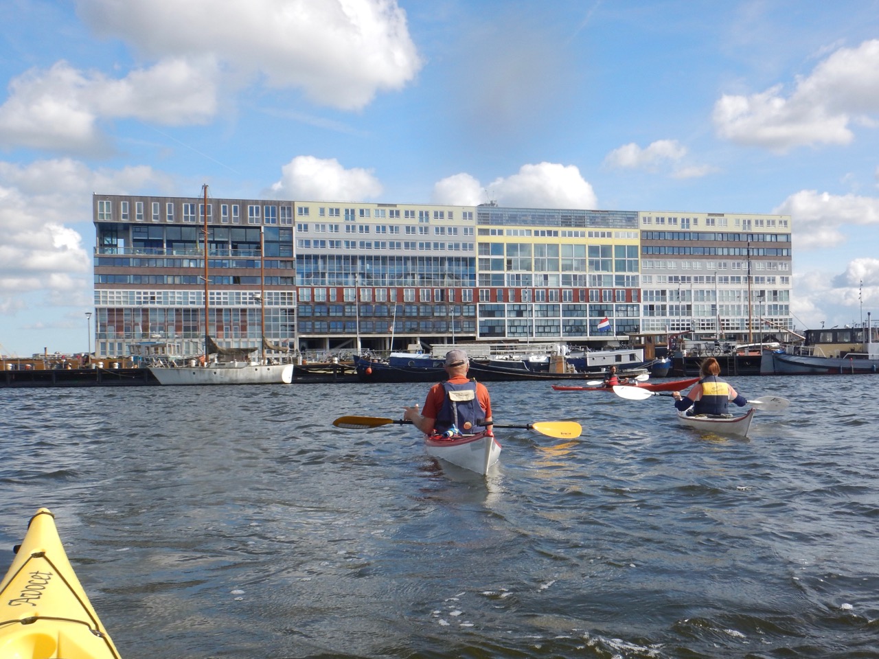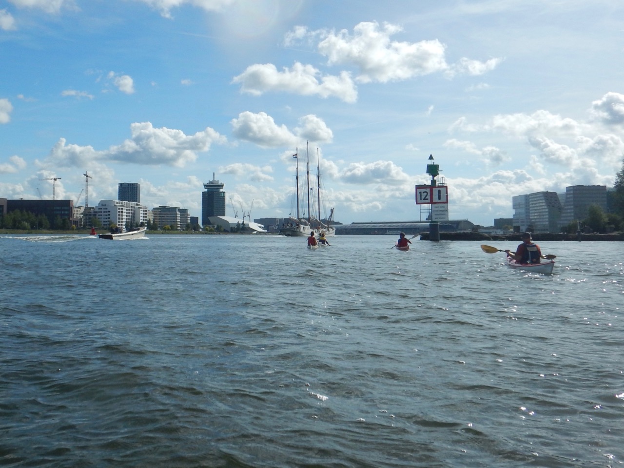 Verrassende tocht o.l.v. Marianne Boer en Hans van Dongen Torman. Weer iets heel anders dan het open en vrije water van het Markermeer. Geheel andere spannende momenten: Wat doe je als de groep omsingeld dreigt te worden door rondvaartboten? Welke route neem je om de vele ponten op het IJ te ontwijken? Of hoe klim je uit je kajak op een hoge wal om een heerlijk drankje en hapje te bemachtigen?