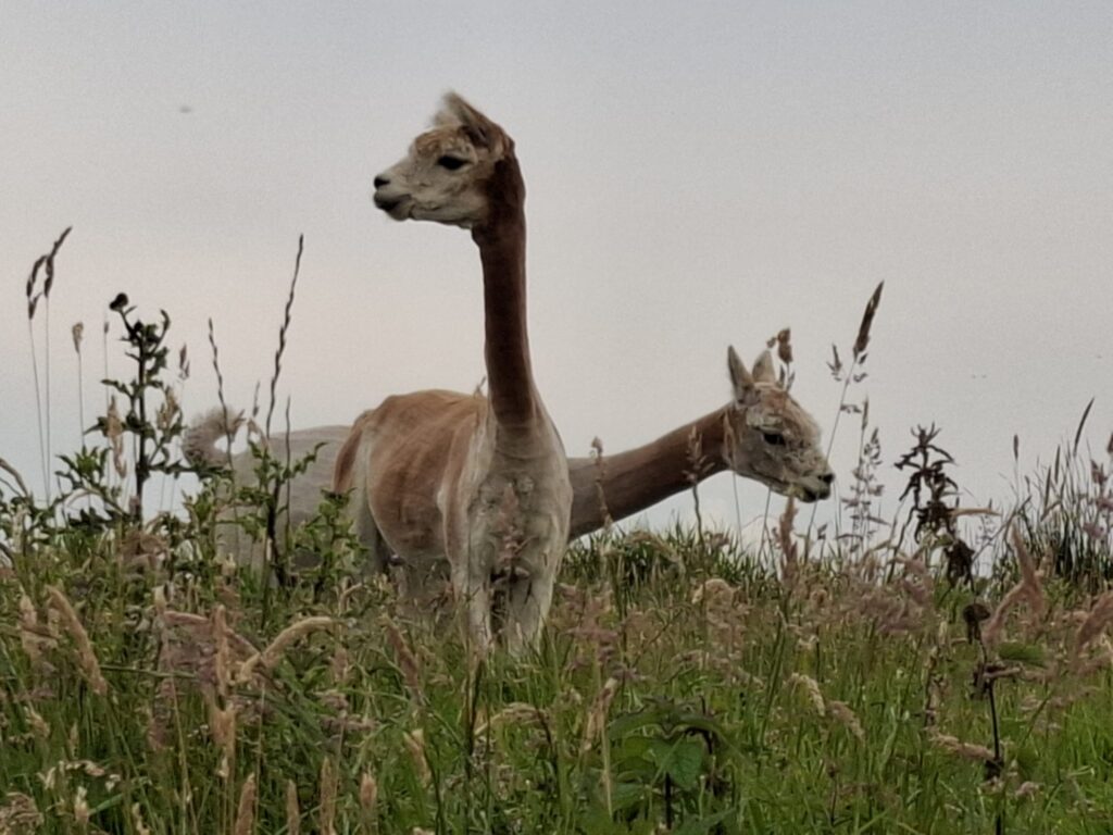 Afgezien van een eenmalige kudde koeien, is het qua vee nogal schaars in dit “grootste weideveengebied van Europa”. Tot plotseling PJ en Irene een zijtak in varen om lama’s/alpaca’s (het juiste antwoord naar postbus 51) te fotograferen. Ze zijn telkens verdwenen, maar na geduldig wachten is bovenstaande foto een feit.