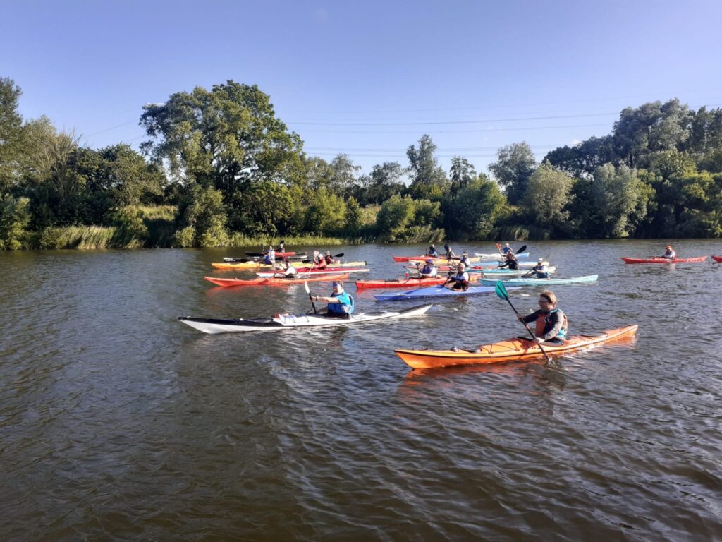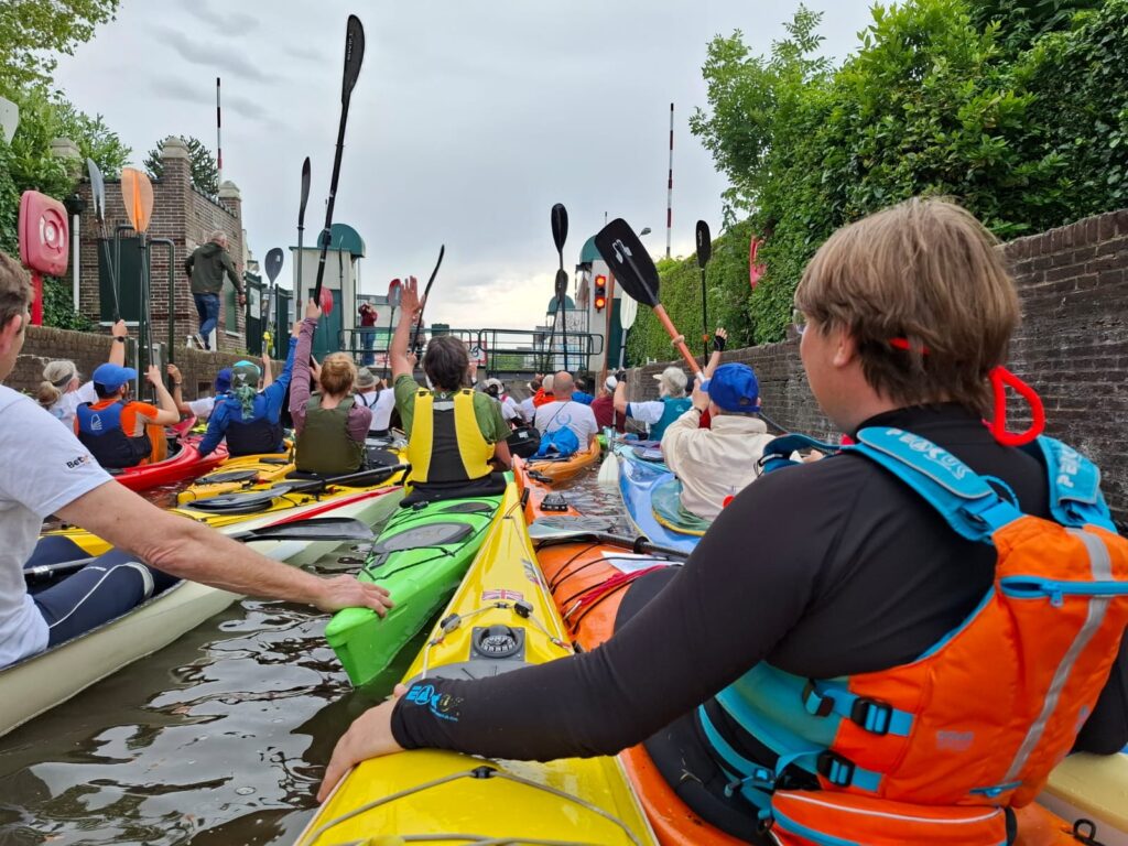 Inmiddels is iedereen ingeschreven, omgekleed en liggen er tientallen kajaks in het water. De Kooijers worden ingedeeld als voor-, tussen-, midden-, boven-, onder- en achtervaarders en aan onze gasten voorgesteld. Na de laatste stichtelijk woorden mag de vloot van tochtleider Irene uitvaren.
