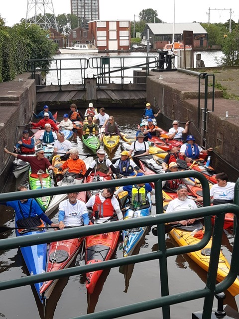 De sluiswachter van vandaag is lid van Qua Vadis en springt pas op de fiets, zodra de laatste kajakker de Zaan op vaart. Het schutten is knus maar we passen er goed in met z’n allen. Een mevrouw met professioneel ogende fotografie spulletjes staat met statief en lange lens op de sluisdeur dus ik heb voor de zekerheid maar ff gelachen. Mochten we die foto’s nog krijgen dan krijg je onze voorkant ook te zien, tot dan zul je het hiermee moeten doen.