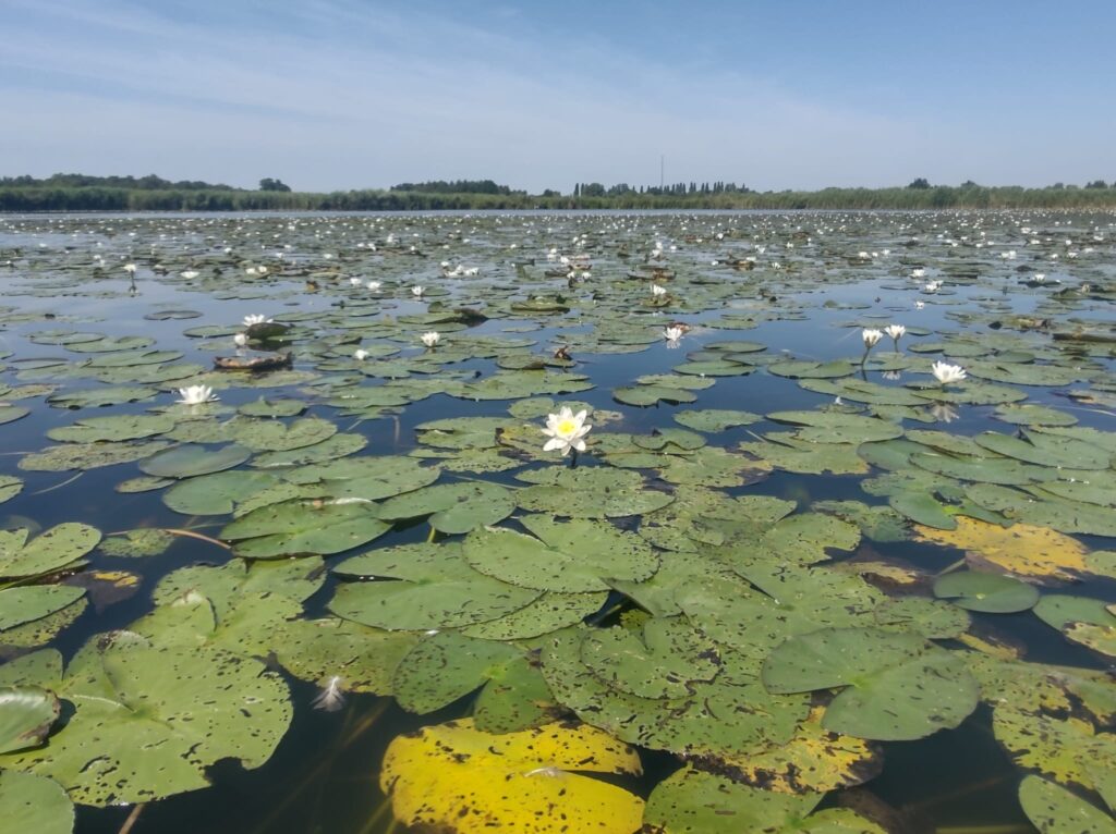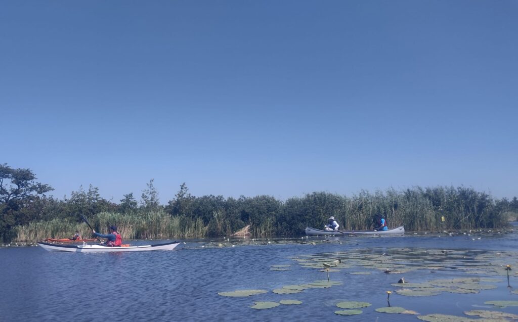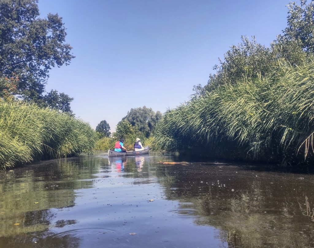 Halverwege verdringen we een Canadees bij een rustplek en trekken we het merendeel van de kajaks aan land. Als een familie in huurkano’s aanstalten maakt om ook aan te meren, schuiven we de Canadees het riet in en maken we plaats. Een van de kinderen duikt het gore water in, waarvan we door de groene aanslag op een van de witte kano’s al hadden bedacht dat het minder slim is. Het land blijkt te drijven en geeft mee als je er op springt, het is ook flink vochtig.