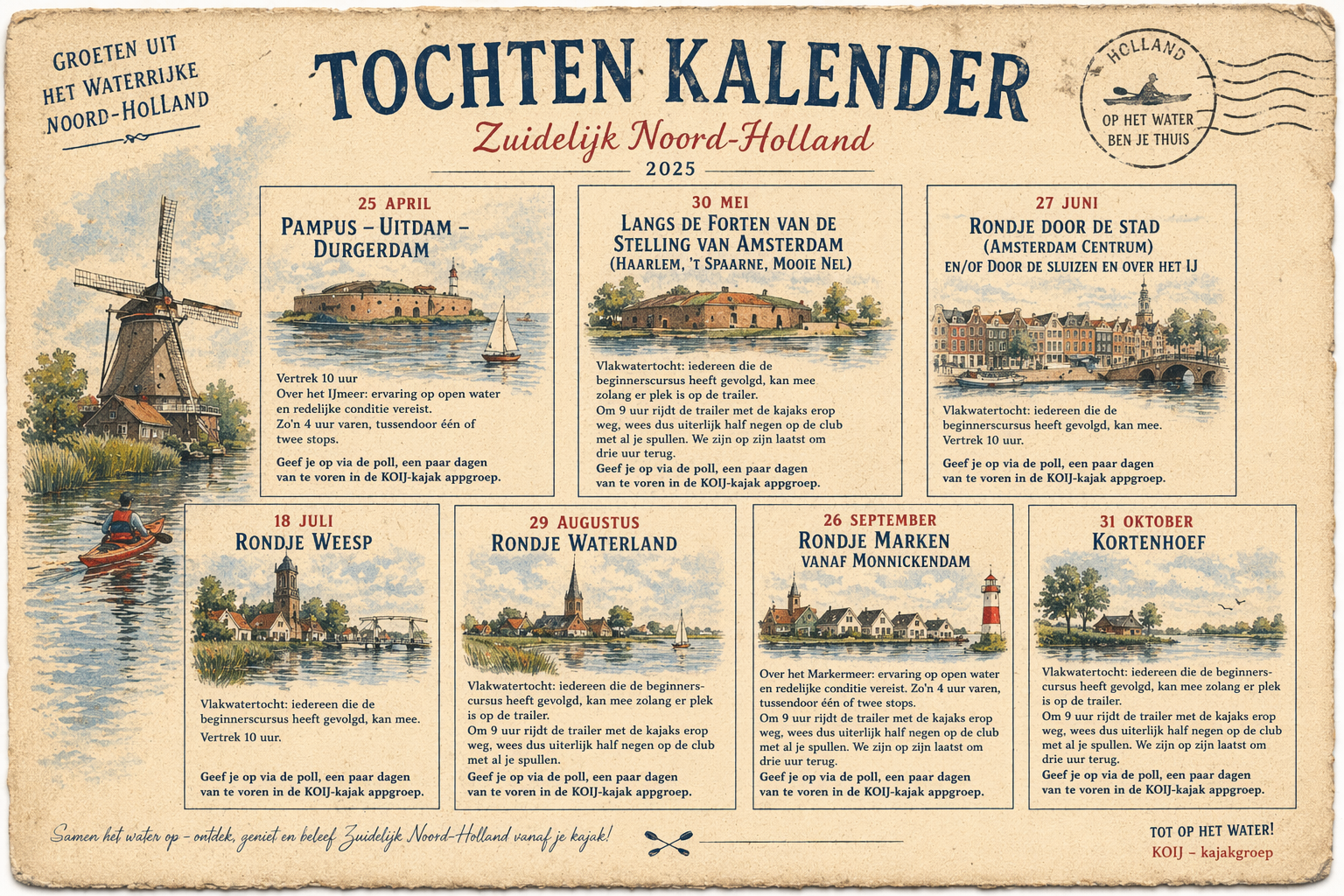 Vertrek 10 uur. Over het IJmeer: ervaring op open water en redelijke conditie vereist. Zo’n 4 uur varen, tussendoor één of twee stops. Geef je op via de poll, een paar dagen van te voren in de KOIJ-kajak appgroep.
